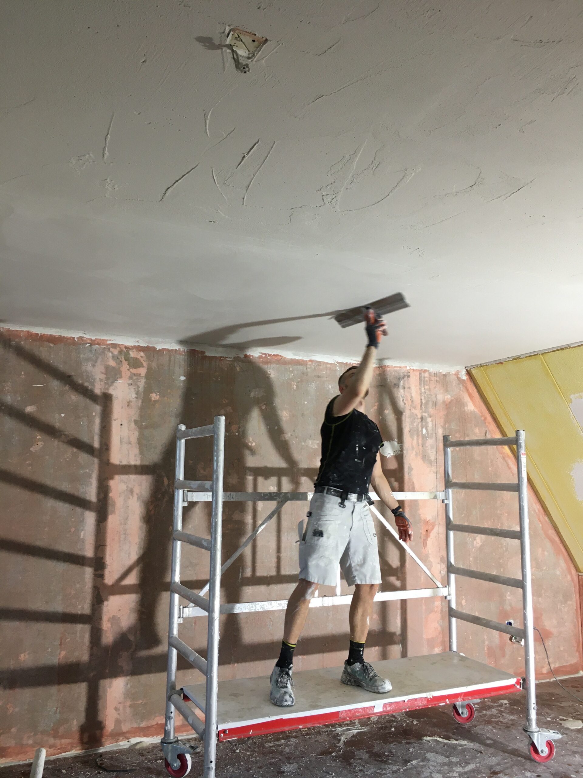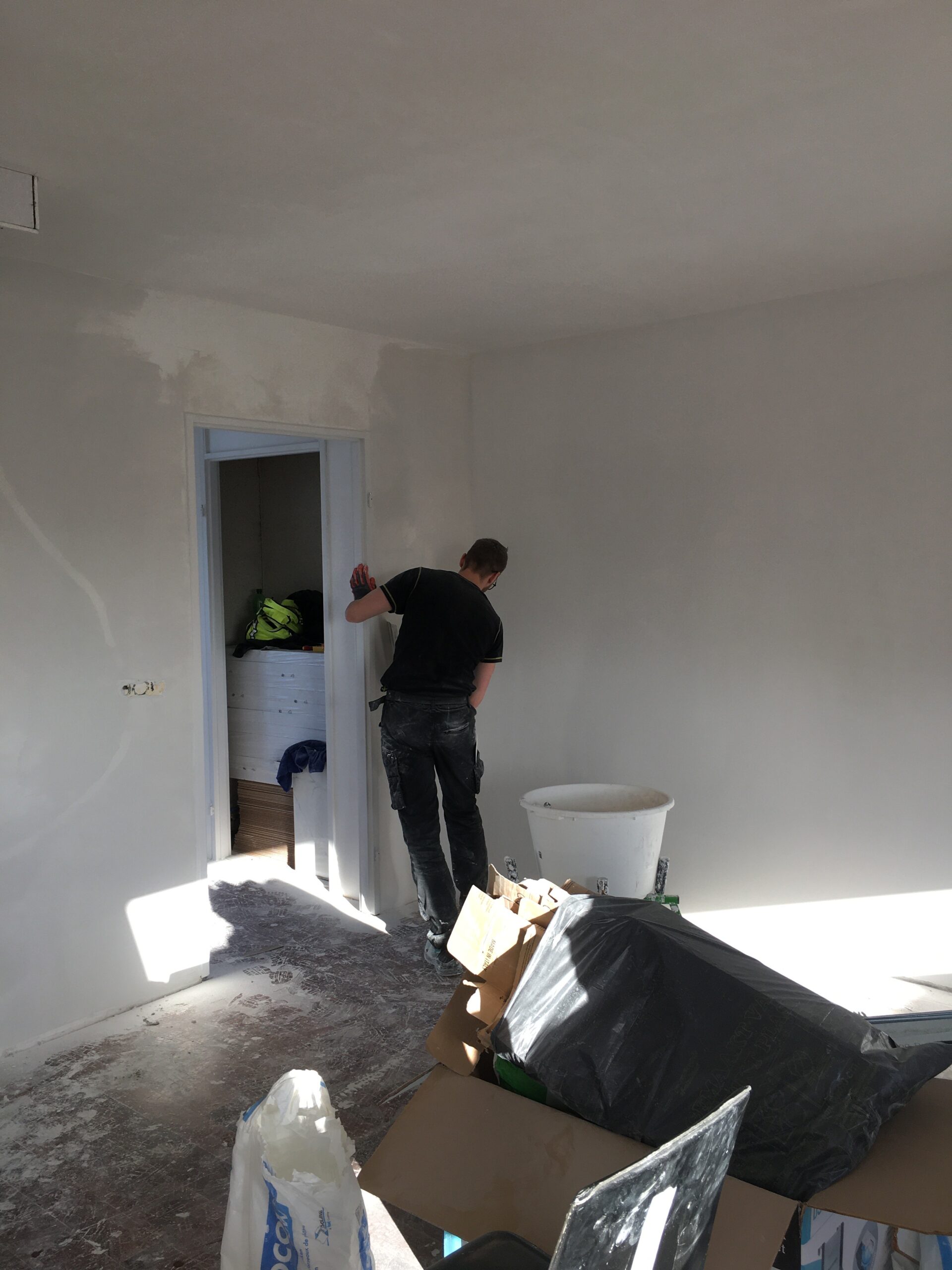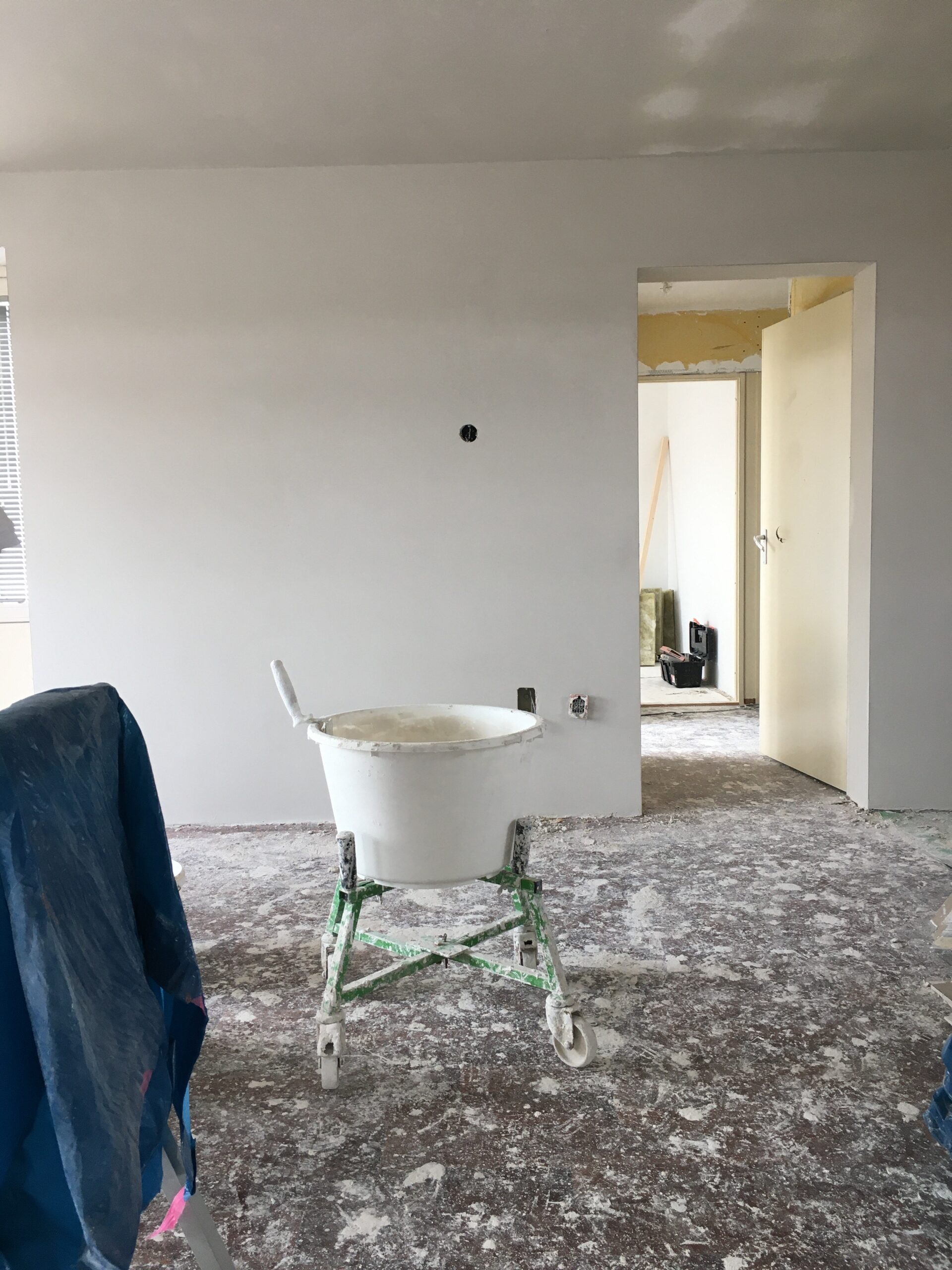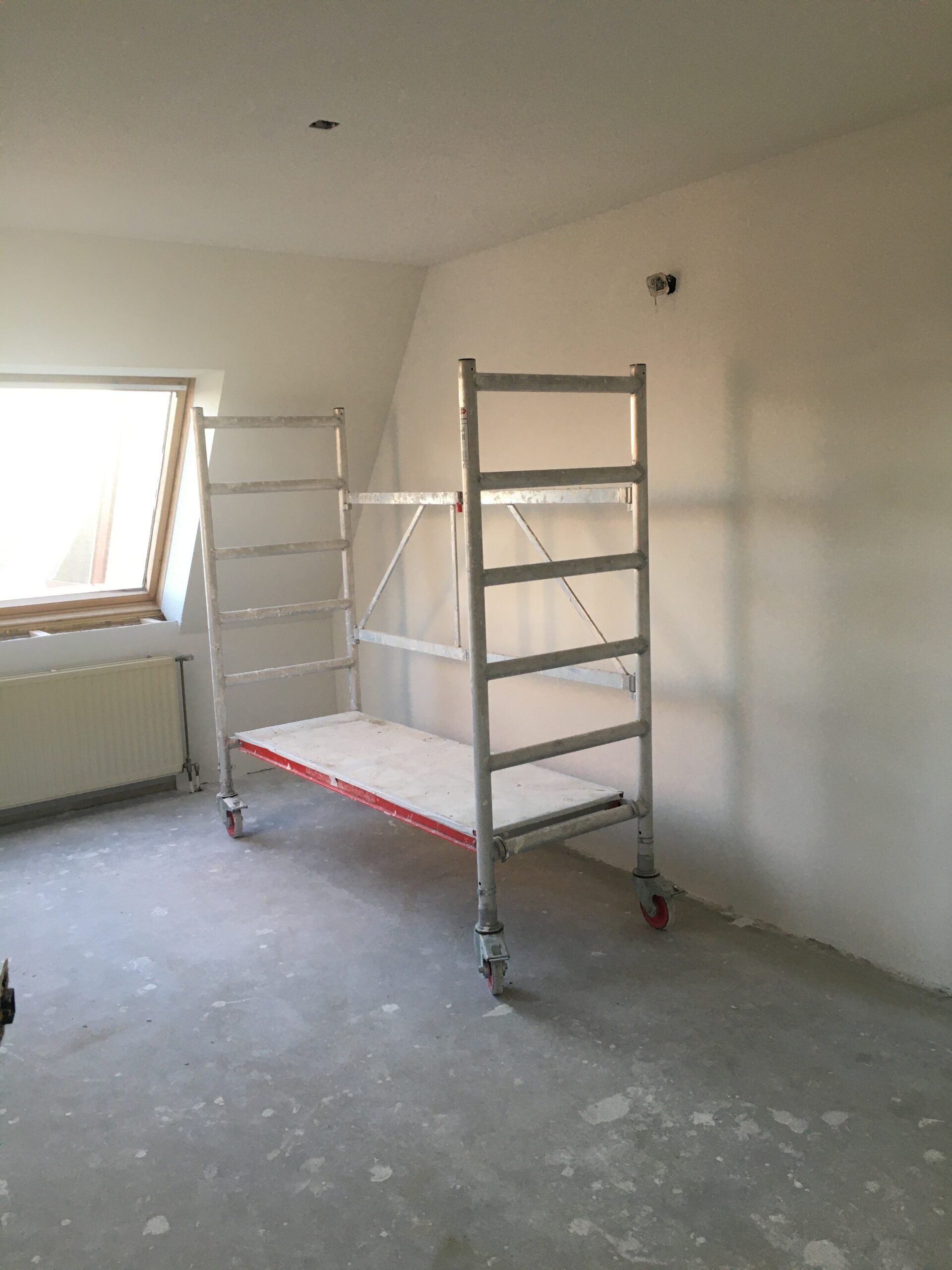 Nauwkeurig pleisteren van muren, inclusief gipsplaten, klaar voor behang of verf.